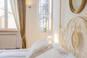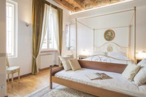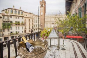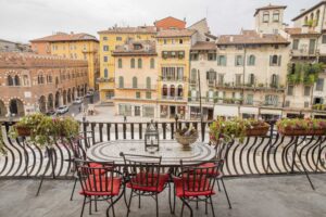 The name of the Piazza Erbe Two-Bedroom Suite with Terrace says it all. A 200 square meter two-bedroom, two-bathroom suite with a large panoramic terrace facing Verona’s most beautiful square, Piazza delle Erbe. This Frescoed apartment is located on the top floor of the famous 15th Century fully Frescoed 13th century palazzo called Casa Mazzanti. Our suites feature a minibar, living room, complimentary high-speed WiFi, flat screen TV , Nespresso machine with unlimited capsules and chilled Prosecco on arrival.