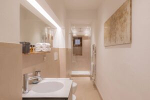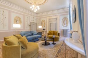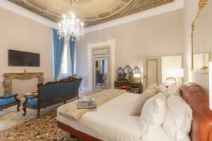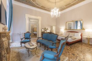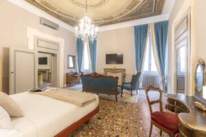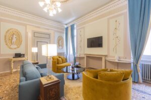 Discover luxury and history in the Statue Suite at Palazzo Camozzini. This 70-square-meter suite boasts 18th-century statues in the living room, offering an elegant backdrop for your stay. With 1 bedroom, 1 bathroom, and a king-size bed for 2 adults, plus a large double sofa bed for 2 children, it’s ideal for families or couples. Enjoy views of San Nicolo church, adding charm to your getaway. Suites includes minibar, complimentary Nespresso, tea and coffee facilities and Corte Realdi’s exclusive in-room Italian breakfast served anytime.
